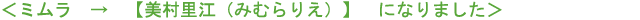 長らく使わせていただいた「みむら」を手放すのも忍びなく、日本に古くからある苗字のひとつなのでそのまま使用(=呼ばれ方はそのまま)、名前は本名です(*2012年6月memo参照)。本名と半々、よくある芸名のスタイルになりました。「所属事務所と揉めて」や「プライベートで何かあって」という理由からではないのでどうぞご安心ください。